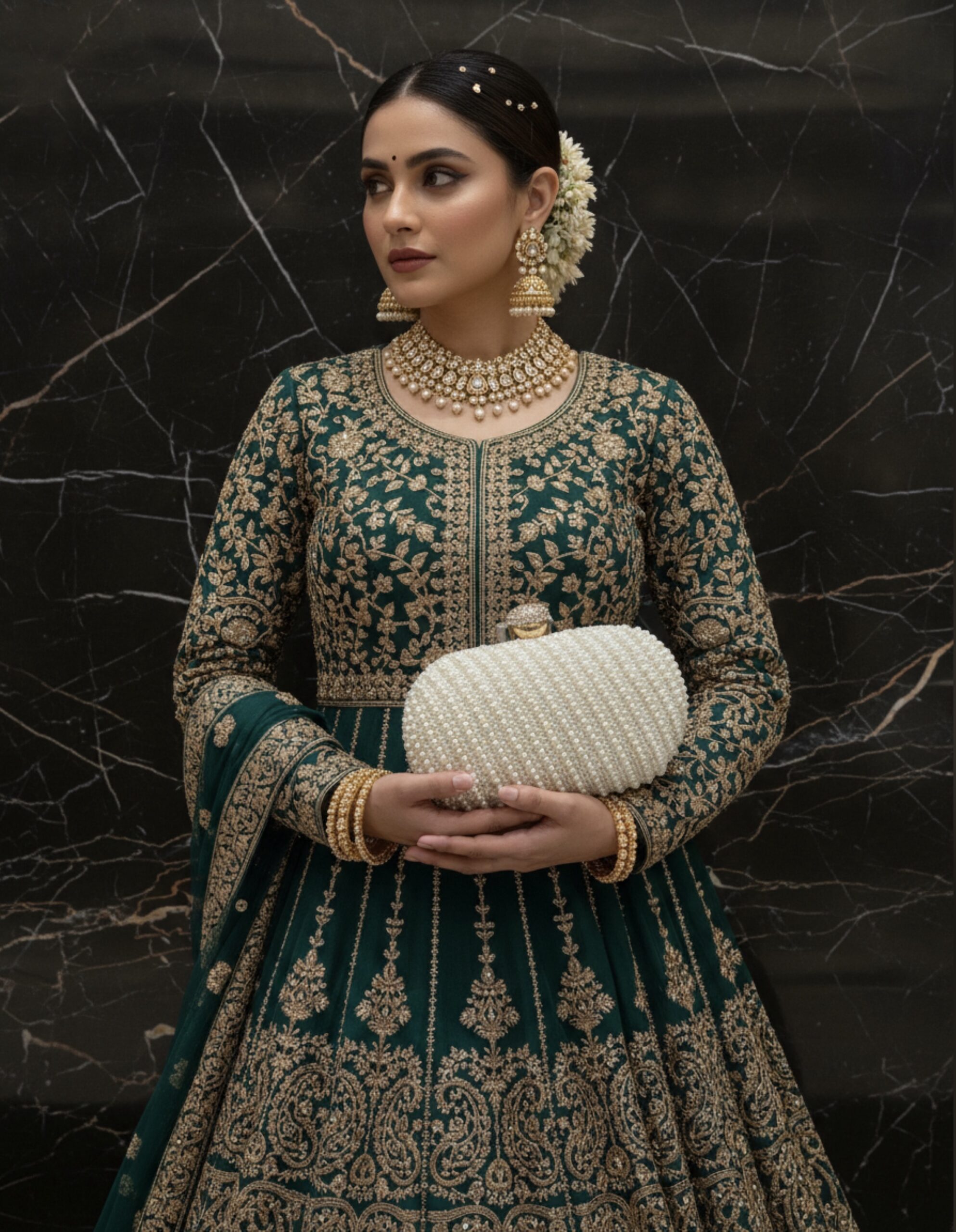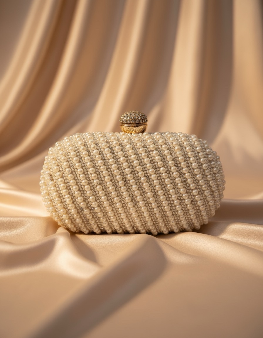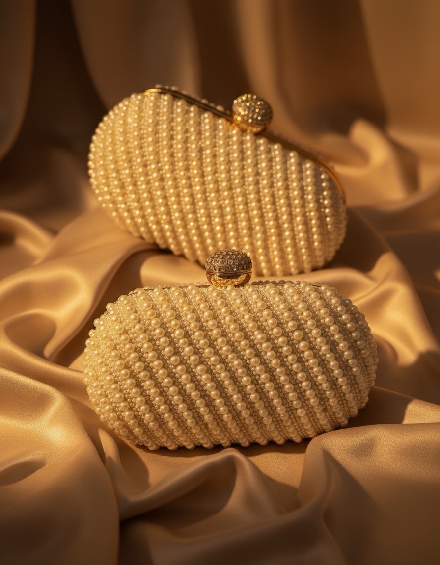 A handcrafted pearl-embellished clutch that blends timeless elegance with modern charm. Designed with intricate detailing, golden accents, and a smooth curved silhouette — perfect for weddings, festive nights, and every moment that deserves to shine.